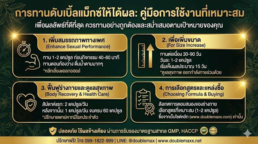 กินดับเบิ้ลแม็กซ์อย่างไรให้ได้ผล?: คู่มือการใช้งานที่เหมาะสม การทานผลิตภัณฑ์เสริมอาหารดับเบิ้ลแม็กซ์ (Double Maxx) อย่างถูกต้องและสม่ำเสมอเป็นสิ่งสำคัญที่จะช่วยให้คุณได้รับผลลัพธ์ที่ดีที่สุด ทั้งนี้เพราะแต่ละคนมีความต้องการและสภาพร่างกายที่แตกต่างกัน การเลือกวิธีการทานที่เหมาะสมตามเป้าหมายและสภาพร่างกายของแต่ละบุคคลจะช่วยเพิ่มประสิทธิภาพในการใช้ผลิตภัณฑ์ได้อย่างเต็มที่