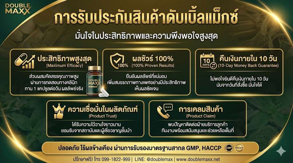 ดับเบิ้ลแม็กซ์ (Double Maxx) เป็นอาหารเสริมที่มีการรับประกันความพึงพอใจจากผู้ผลิต ด้วยรายงานการทดสอบทางคลินิกที่พิสูจน์ถึงคุณภาพและประสิทธิภาพของผลิตภัณฑ์ หากคุณต้องการเสริมสมรรถภาพทางเพศและความมั่นคงอย่างแท้จริง ดับเบิ้ลแม็กซ์ (Double Maxx) คือทางเลือกที่คุณไม่ควรพลาด